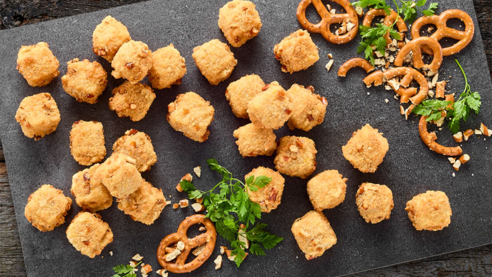Er kendetegnet ved den grove pretzelpanering, der giver et rustikt udseende.